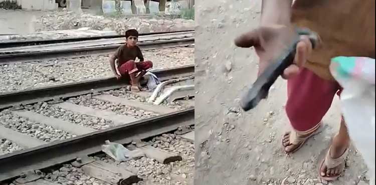 Karachi – A young boy was caught on camera stealing iron bolts from a railway track near the Wireless Gate in Shah Faisal Colony. In the video, the child is seen removing bolts used to secure the tracks, raising concerns about potential safety hazards.