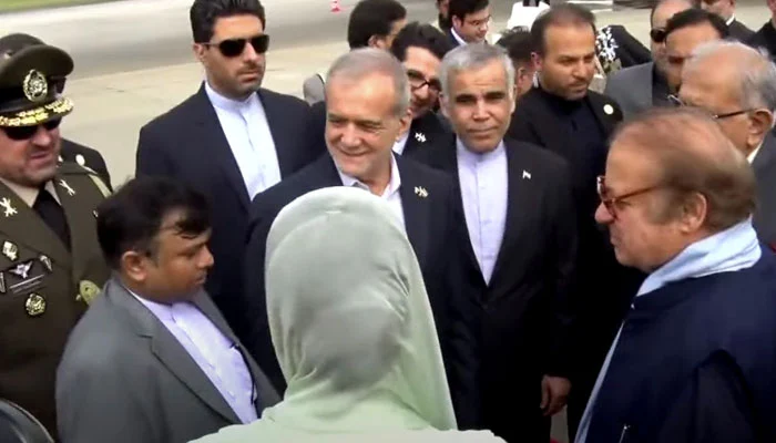 LAHORE – Iranian President Dr Masoud Pezeshkian arrived in Lahore on an official visit to Pakistan. He was warmly received by PML-N leader Nawaz Sharif and Punjab Chief Minister Maryam Nawaz at the airport.